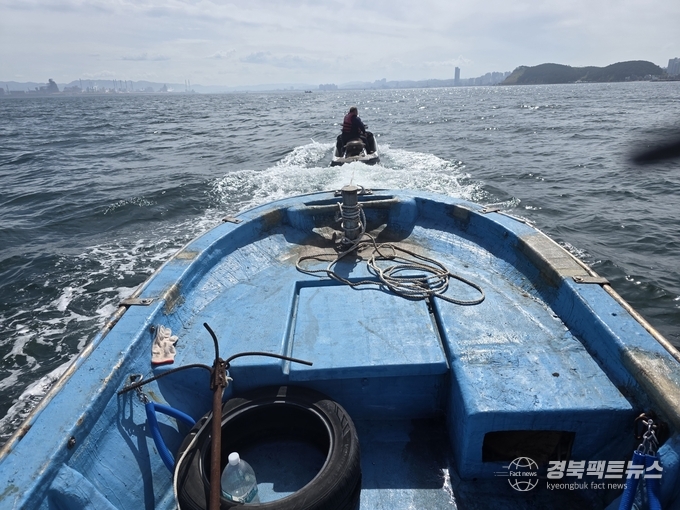경북팩트뉴스 남유신 기자 | (사)한국해양안전협회 영일만지부는 지난 19일 신규 조종면허 취득 회원들을 대상으로 수상오토바이 인명구조 활동 교육을 실시하던 중, 죽천 앞바다에서 표류 중이던 소형선박을 긴급 구조했다고 밝혔다.
