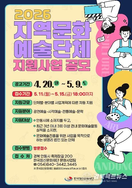 경북팩트뉴스 남유신 기자 | 안동시 한국정신문화재단은 5월 11일부터 5월 15일 18시까지 관내 문화예술단체를 대상으로 ‘지역문화예술단체 지원사업’ 참여단체를 공개 모집한다.