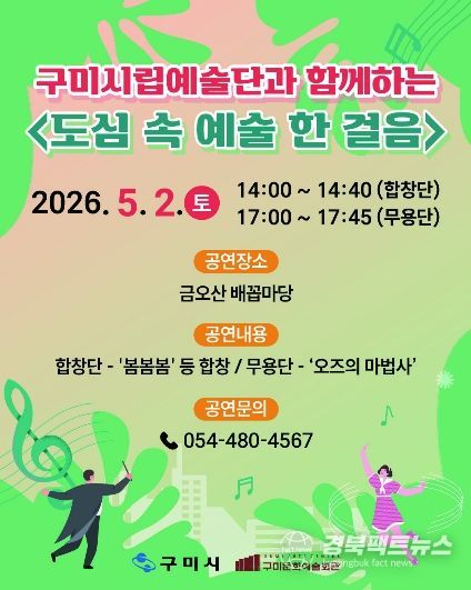 경북팩트뉴스 조현묵 기자 | 구미시는 가정의 달을 맞아 5월 2일 금오산 배꼽마당에서 구미시립예술단과 함께하는 야외공연 '도심 속 예술 한 걸음'을 개최한다.