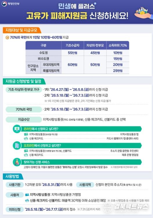 경북팩트뉴스 남유신 기자 | 영덕군은 고유가·고환율·고물가로 인해 가중된 군민들의 경제적 부담을 덜고 민생 안정을 도모하기 위해 ‘고유가 피해 지원금’을 오는 27일부터 1차 신청을 받아 본격적으로 지급한다.