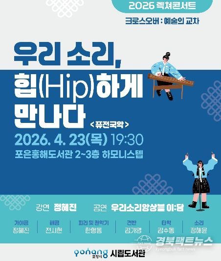 경북팩트뉴스 남유신 기자 | 포항시는 오는 23일 포은흥해도서관 하모니스텝에서 ‘2026 렉쳐콘서트 - 크로스 오버 : 예술의 교차’의 첫 시간 ‘우리 소리, 힙(Hip)하게 만나다’를 운영한다.