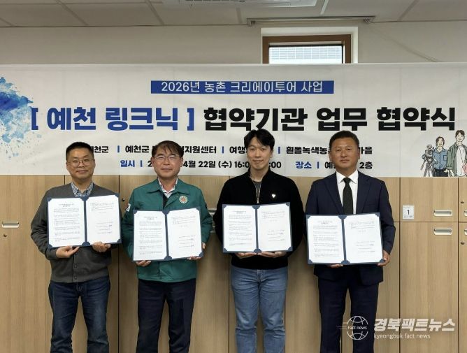 경북팩트뉴스 남유신 기자 | 예천군은 지난 22일 오후 4시, ‘농촌 크리에이투어’ 사업의 체계적인 추진과 민·관 협력 강화를 위한 민간 협의체를 구성하고 업무 협약을 체결했다고 밝혔다.