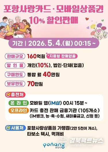 시는 올해 들어 이달까지 총 1,230억 원 규모의 포항사랑상품권을 발행한 데 이어, 이번 할인 판매분 160억 원을 유통해 지역 상권 내 소비를 촉진하고 경기 회복 흐름을 이어간다는 방침이다.