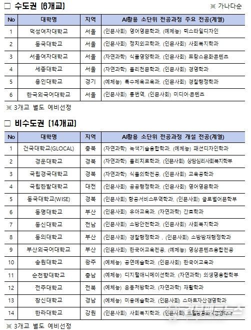 선정 대학은 인공지능(AI)의 윤리적 활용과 비판적 사고 등 인공지능(AI) 전반에 대한 ‘기초 교양 교과’와, 인공지능(AI)을 비공학계열 전공에 활용하는 ‘인공지능(AI) 활용 소단위 전공 과정’을 개발·운영하게 된다. 또한, 학습자에게 양질의 인공지능(AI) 교육을 제공할 수 있도록 교수자 역량 강화와 관리 체계 구축도 병행 추진한다. 개발된 교육과정을 타 대학과 공유하고, 대학 현장 전반에 인공지능(AI) 교육의 확산을 도모한다.