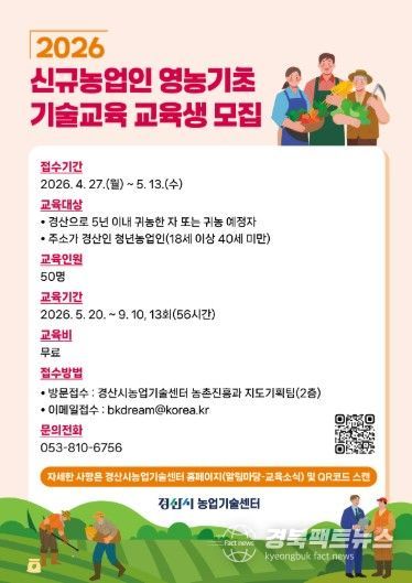 경북팩트뉴스 남유신 기자 | 경산시는 신규농업인(귀농·귀촌) 및 청년농업인의 안정적인 농업·농촌 정착을 위해, 2026년 신규농업인 영농기초 기술교육 교육생을 오는 5월 13까지 모집한다.