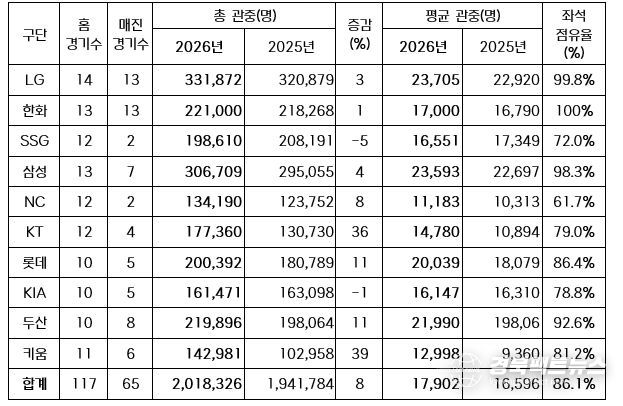 오늘 경기까지 평균 관중은 1만 7,902명으로 지난해 동 경기 수 대비 약 8% 증가했다.