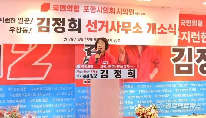 경북팩트뉴스 남유신 기자 | 국민의힘 김정희 포항시의원 예비후보(우창동)가 지난 25일 선거사무소 개소식을 열고 본격적인 선거 행보에 돌입했다. 이날 행사에는 지역 주민과 지지자, 각계 인사들이 참석해 성황을 이뤘다.