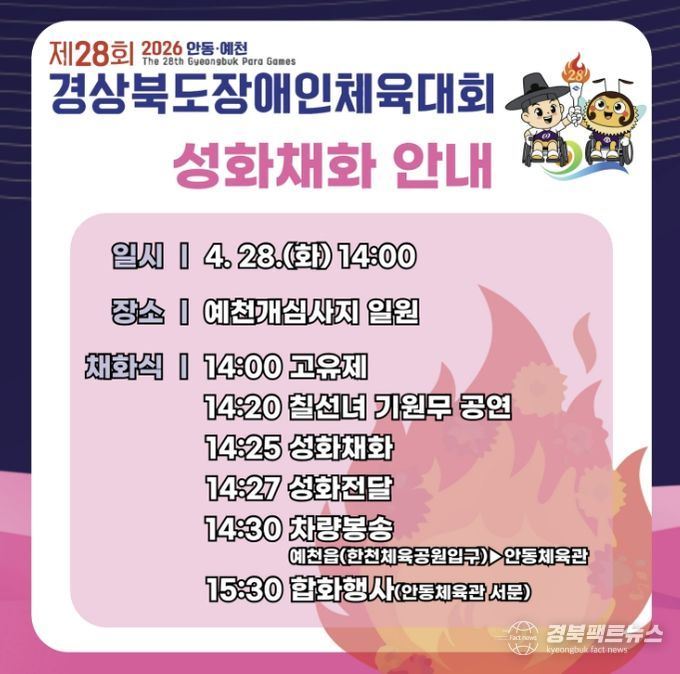 한편, 제28회 경상북도장애인체육대회는 오는 4월 29일부터 4월 30일까지 이틀간 안동시 일원 경기장에서 개최되며, 도내 시·군 선수단이 참가해 각종 종목에서 뜨거운 열전을 이어갈 예정이다.