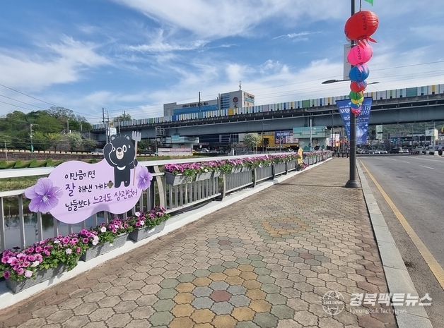 이번 사업은 김천시를 대표하는 3개 교량(직지교, 김천교, 교동교)과 김천시농업기술센터 입구 진흥교를 대상으로 진행되며, 교량 난간대에 꽃과 조화를 이루는 대표 캐릭터 ‘오삼이’와 ‘감성형 글귀’를 활용한 오브제를 배치해 시민들에게 일상 속 작은 위로와 힐링 공간을 제공하는 데 목적이 있다.