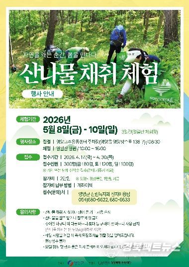영양군 관계자는 “산나물채취체험행사는 자연 속에서 직접 봄을 느낄 수 있는 대표 체험 프로그램으로, 영양산나물축제를 더욱 풍성하게 만드는 중요한 콘텐츠”라며 “참가자들이 일월산의 자연을 체험하며 산나물의 매력을 직접 느낄 수 있기를 기대한다”라고 밝혔다.