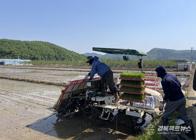 경북팩트뉴스 남유신 기자 | 경산시 자인면 울옥리 신호철 농가는 27일 자인면 원당들 일원 6ha에 올해 첫 모내기를 실시했다.
