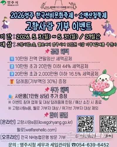 조종근 세무과장은 “이번 행사는 한국선비문화축제와 소백산철쭉제가 함께 열리는 시기에 맞춰 진행되는 만큼, 영주의 문화·관광 자원을 널리 알리고 고향사랑기부제 참여를 확대하는 계기가 될 것으로 기대한다”며 “축제 기간을 맞아 많은 분들이 영주에 따뜻한 마음을 전해주시길 바란다”고 말했다.