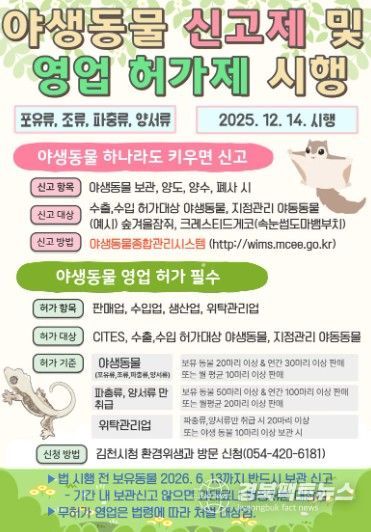 경북팩트뉴스 남유신 기자 | 김천시는 야생동물의 무분별한 포획·거래를 방지하고 건전한 사육 문화를 정착시키기 위해 야생동물 영업 허가제와 보관·거래 신고제를 시행하고 있다고 밝혔다.