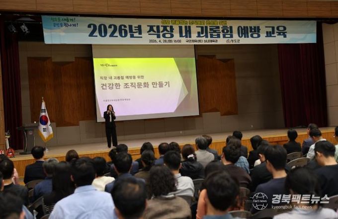 경북팩트뉴스 남유신 기자 | 청도군은 4월 28일 국민체육센터 실내체육관에서 김동기 청도군수 권한대행을 비롯한 간부 공무원과 전 직원이 참석한 가운데 ‘2026년 직장 내 괴롭힘 예방 교육’을 실시했다.