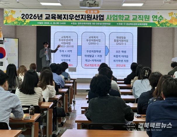 경북팩트뉴스 이영하 기자 | 경상북도경주교육지원청은 2026년 4월 28일 경주교육지원청 다온실(3층 대회의실)에서 ‘2026년 교육복지우선지원사업 2권역 사업학교 교직원 연수’를 개최했다.
