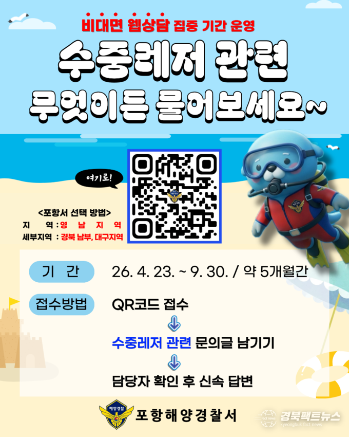 경북팩트뉴스 남유신 기자 | 포항해양경찰서가 본격적인 수중레저활동 성수기를 앞두고 관내 사업장에 대한 전수조사에 나서며 안전관리 강화에 나섰다.