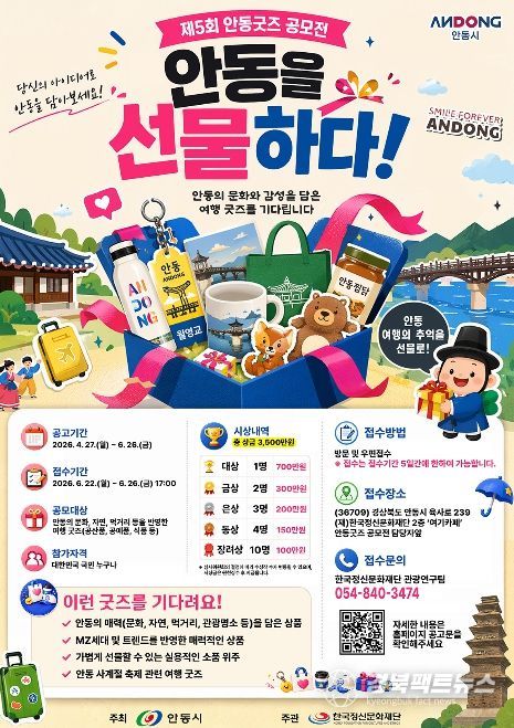 경북팩트뉴스 남유신 기자 | 안동시와 (재)한국정신문화재단은 관광거점도시 안동의 지역 브랜드 가치를 높이고 경쟁력 있는 관광 상품을 발굴하기 위해 『제5회 안동을 선물하다! 안동굿즈 공모전』을 개최한다고 밝혔다.