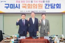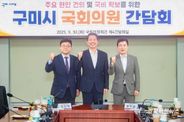 경북팩트뉴스 조현묵 기자 | 구미시는 9월 30일 국회를 방문해 구자근, 강명구 지역구 국회의원과 간담회를 열고 지역 주요 현안과 국비 확보 전략을 논의했다. 이날 간담회에는 김장호 시장을 비롯해 구미시 주요 간부 공무원 등 30여 명이 참석했다. 시는 현안 사업 추진 상황과 정부 예산 동향을 공유하며 국회 차원의 전략적 지원 방안을 모색했다. 주요 현안사업으로는 △구미국가산업단지 1~3단지 연결교량 신설 △구미~신공항 철도건설 △대한민국역사박물관(구미산업화역사관) 건립 △새마을운동중앙회 및 연수원 유치 △'5극 3특'국가균형성장 전략 대응 △한국은행 구미지역본부 유치 △'방위산업 소재ㆍ부품ㆍ장비 특화단지'유치 △국가 푸드테크 클러스터 조성 등이 논의됐다. 주요 국비사업으로 △구미시 제조창업 인큐베이팅 센터 구축 △AX 실증산단 구축 사업 △지역 주력 중소기업형 인공지능 데이터 스페이스 구축 △차세대 디스플레이 핵심부품ㆍ소재 기술개발 △반도체 장비 챔버용 소재부품 제조 및 검증 테스트베드 구축 △수요확대형 배터리 테스트베드 구축 △구미 산동 국민체육센터 조성 △푸드테크 연구지원센터 구축 △펫테크 산업화 지원센터 구축 △4단