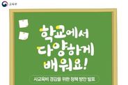 경북팩트뉴스 이경원 기자 | 학교에서 다양하게 배워요! - 사교육비 경감을 위한 정책 방안 발표 프로그램 확대 및 예술·스포츠 지원 강화로 공교육 역량을 강화합니다! · 연 50만 원 초3 방과후 프로그램 이용권 지원 확대(57.2%→70%) · 학교에서 '1인 1예술·스포츠' 활동 지원(2027년~) · 초 1, 2학년 신체활동을 위해 '건강한 생활' 과목 분리 개편(2028년~) · 읽기·쓰기·셈하기 기초학력 진단검사 지속 실시 문해력 향상 및 기초학력 교육 강화로 국가책임 교육을 실현합니다! · 글쓰기·논술 프로그램을 학교도서관과 연계하여 운영 · 방과후와 방학 중에 초·중·고 학생 6만 명에게 학기당 20시간 내외의 1:1 교과 보충 지도 실시 · EBS 중학프리미엄, 고교 강의로 양질의 콘텐츠 제공 진로·진학 설계 및 자기주도학습 지원을 내실화합니다! · 대입정보포털 '어디가'에서 AI 활용 진학상담으로 맞춤형 학업설계 제공 · 고교 교사 중심의 진로·학업 설계 중앙지원단 확대 (1000명, 함께학교) · 2027년까지 자기주도학습센터 100개소 선정·운영 · '사