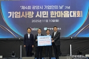 경북팩트뉴스 남유신 기자 | 포항상공회의소(회장 나주영)는 지난 10일 광양실내체육관에서 열린 ‘제4회 광양시 기업인의 날’ 행사에서 관내 회원사 임직원들이 모금한 고향사랑기부금 9,200만 원을 광양시에 전달했다. 이날 기탁식에는 나주영 포항상공회의소 회장을 비롯해 정인화 광양시장, 우광일 광양상공회의소 회장 등이 참석해 두 도시 간 우정과 상생의 의미를 되새겼다. 이번 기부는 지난해부터 이어져 온 포항상의-광양상의 상호 기부 활동의 일환으로, 자매도시 간의 협력과 지역 상생 발전을 한층 더 공고히 하는 계기가 되었다. 특히 두 상공회의소는 지난해 각각 500만 원씩을 상호 기부한 데 이어, 올해 9월에는 우광일 광양상의 회장이 포항을 방문해 광양 회원사 임직원들이 모금한 5,600만 원을 포항시에 전달한 바 있다. 나주영 회장은 “철강으로 이어진 두 도시의 인연이 나눔으로 이어져 더욱 뜻깊다”며 “앞으로도 포항과 광양이 지역경제 활성화와 공동 발전을 위해 긴밀히 협력하길 바란다”고 말했다.
