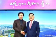 경북팩트뉴스 남유신 기자 | 조현일 경산시장은 17일 김두겸 울산시장을 만나 ‘경산~울산 간 고속도로 건설’ 사업 확정을 위해 공동 대응하기로 뜻을 모았다. 경산~울산간 고속도로는 기존 경주시를 경유하는 경부고속도로 또는 밀양시를 경유하는 신대구부산고속도로 및 밀양울산고속도로를 이용하여 우회하던 노선을 경산시와 울산광역시를 직결 노선으로 전환해 거리는 23km, 시간은 16분 단축할 수 있는 사업이다. KOSIS(국가통계포털, KOrean Statistical Information Service)에 따르면, 2022년 기준 제조업 분야 중소기업의 물류비는 매출액 기준 6.71%를 차지하고 있으며, 이 중 운송비는 57.9%로 총매출 대비 3.89%에 달한다. 경산시의 자동차부품 관련 기업(2023년 기준 2,000여 개 이상)의 총매출 5조 8,473억 원에 적용하면 약 2,274억 원이 운송비로 지출되는 규모이며, 고속도로 건설 시 최소 31.5%의 운송 거리 단축 효과가 발생함에 따라 연간 약 716억 원의 물류비 절감이 가능한 것으로 추정된다. 또한, 절감된 물류비가 기업 내 재투자 되면 생산