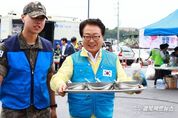 경북팩트뉴스 남유신 기자 | 울진군은 지난 9월 18일 죽변면 해군부대 주차장 일원에서 울진군종합자원봉사센터(센터장 장태윤) 주관으로‘참! 좋은 사랑의 밥차와 함께하는 행복마을 재능 나눔 활동’을 성황리에 개최했다. 이번 행사에는 14개 자원봉사단체, 죽변항에 위치한 해군 1함대 포항대대 214전진기지대 장병 등 500여 명이 참여하여 지역사회에 따뜻한 나눔을 전했다. 이날 제공된 식사는 IBK기업은행의 후원과 한국자원봉사센터협회의 지원으로 운영된‘참! 좋은 사랑의 밥차’를 통해 마련돼 이웃의 정을 나누는 계기가 됐다. 특히 손 마사지, 네일아트, 메이크업, 즉석 사진 촬영과 액자 제작, 타로 상담 등 다양한 재능 나눔 봉사활동이 어우러져 주민들이 직접 참여하고 소통하는 축제의 장으로 꾸며졌다, 손병복 울진군수는“자원봉사는 단순한 나눔을 넘어 지역사회를 잇는 연결고리로서 중요한 의미를 가진다”며“군민 모두가 더불어 행복한 울진을 만들기 위해 지속적으로 지원할 것”이라고 밝혔다.